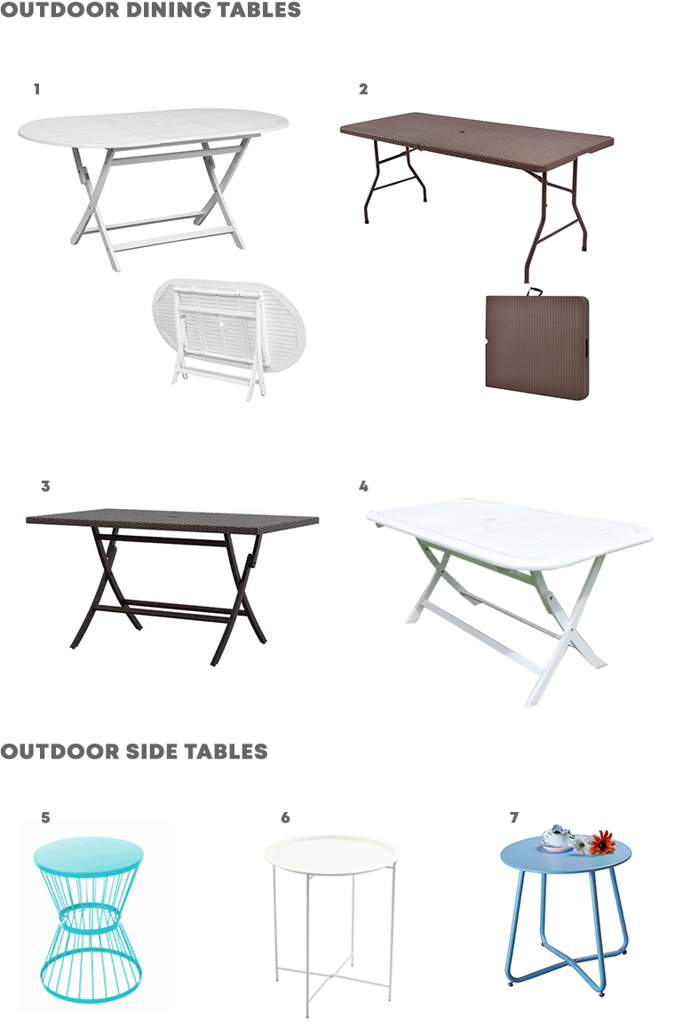 Let’s start with the outdoor dining tables we’re considering. All the dining tables you see below are foldable, have an umbrella hole in the center and very affordable! It’s a pretty specific criteria since I prefer being able to fold the table away for the rainy/winter season. Pretty impressed with the cost-effective and beautiful pieces I found so far!