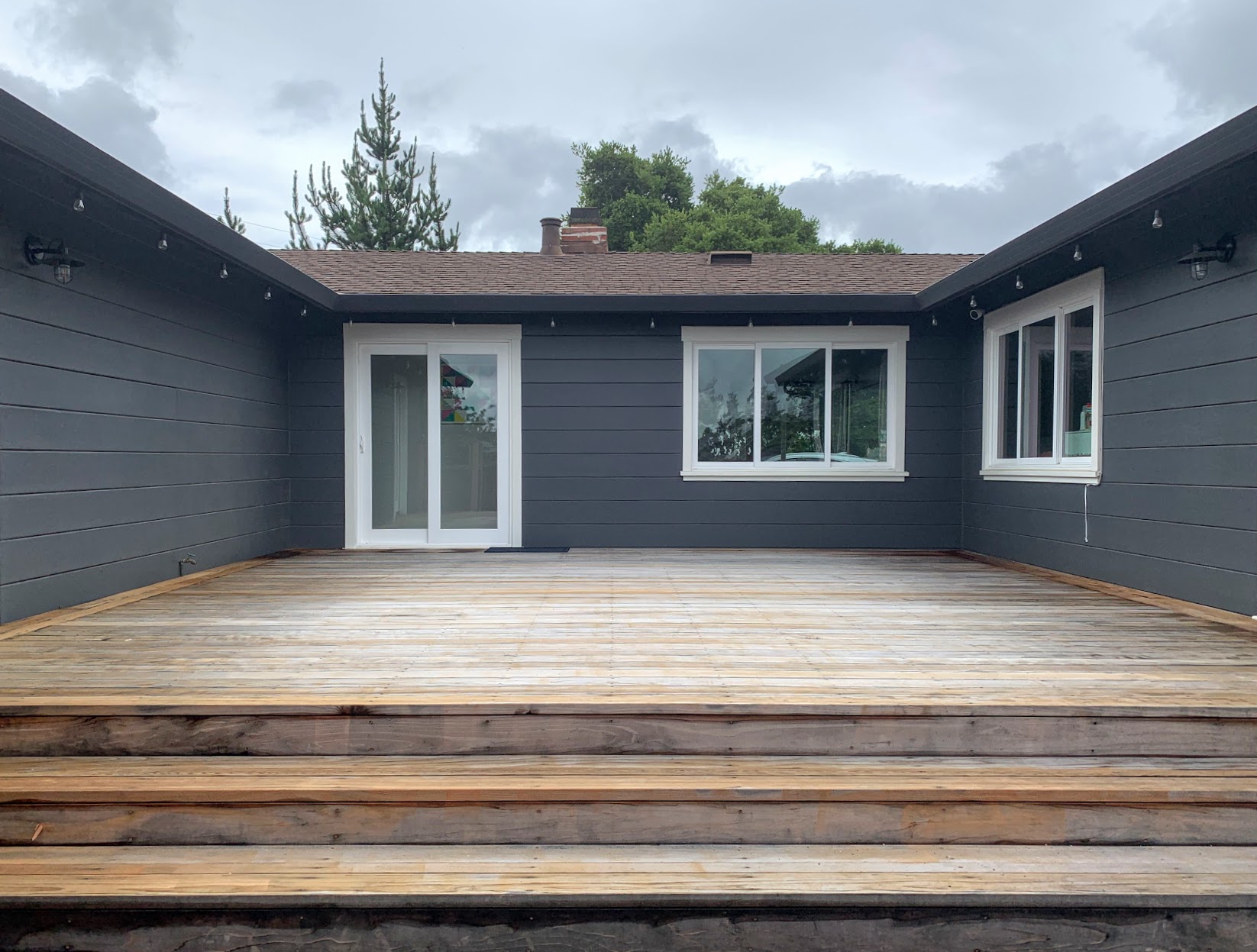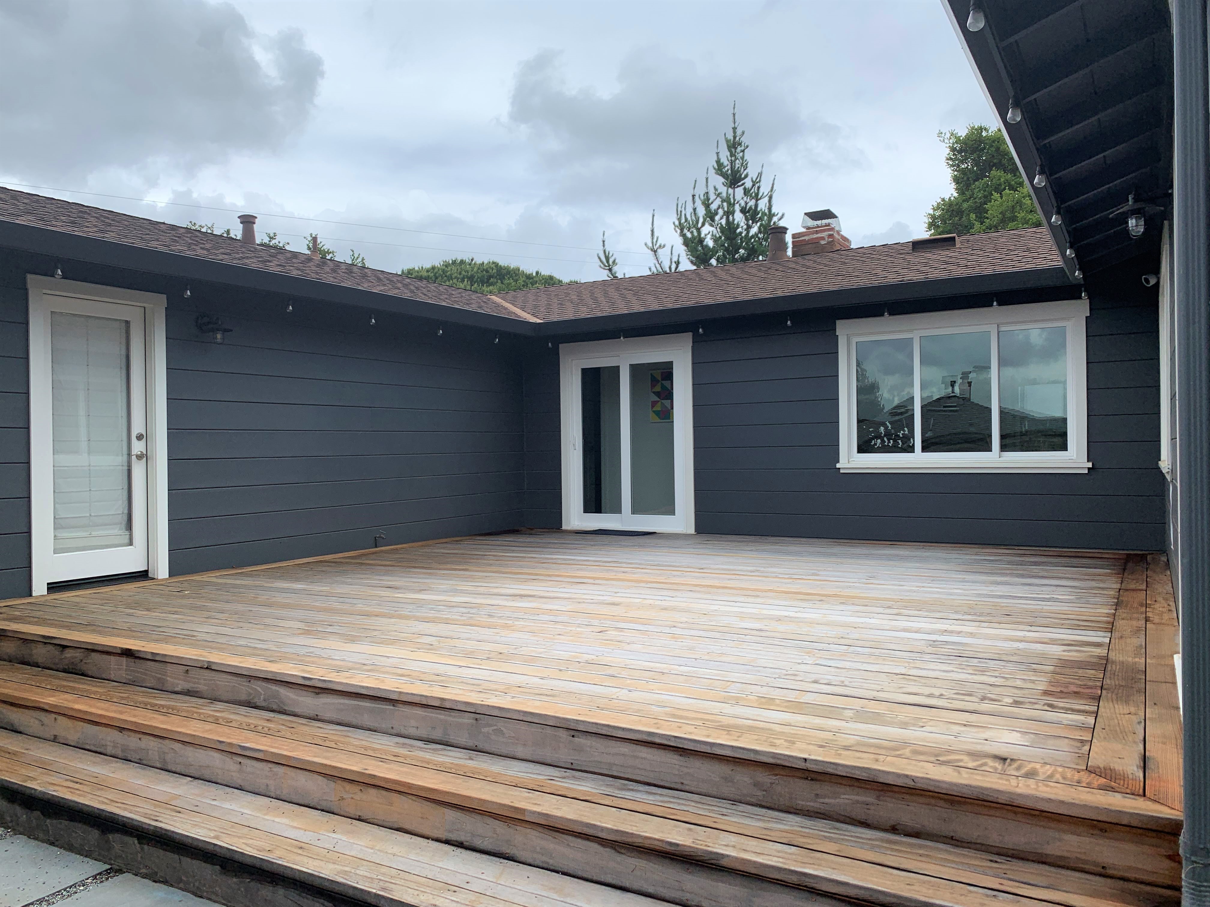 Before we get into the furniture options we considered, here are some pictures of the deck to orient you. We haven’t finished staining/sealing the redwood planks yet so they’ll look much more even in tone/color once that’s done. Even though technically it’s a generous sized deck, it is accessed from 3 areas (the living, hallway and our bedroom) and ideally we’d like to keep all those paths clear.