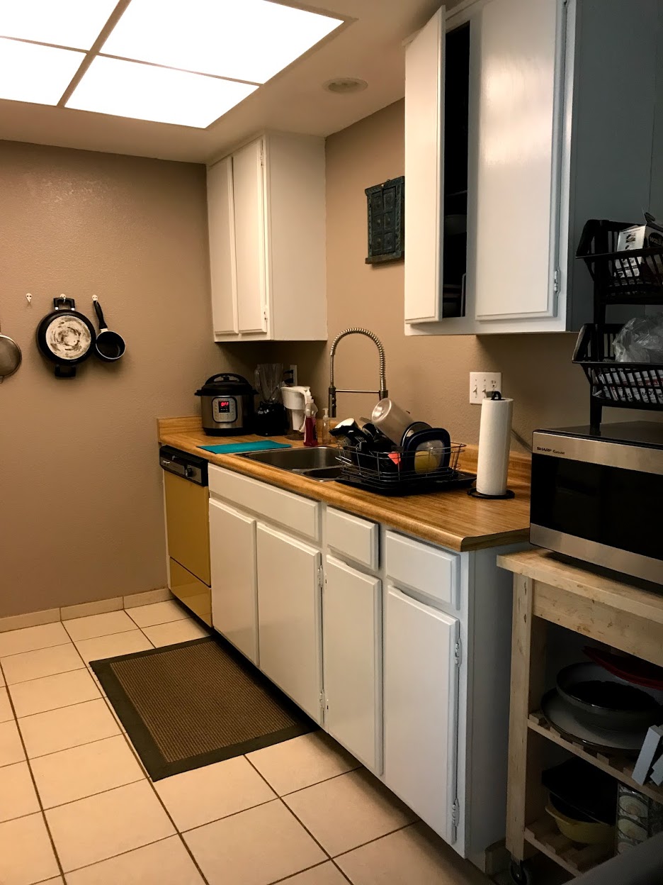 BEHR White Paint | BEHR Turquoise Paint | Backsplash Tile | Cabinets & Edge Pull | Floor Tile| Countertop (What we selected is out of stock, here’s something similar)