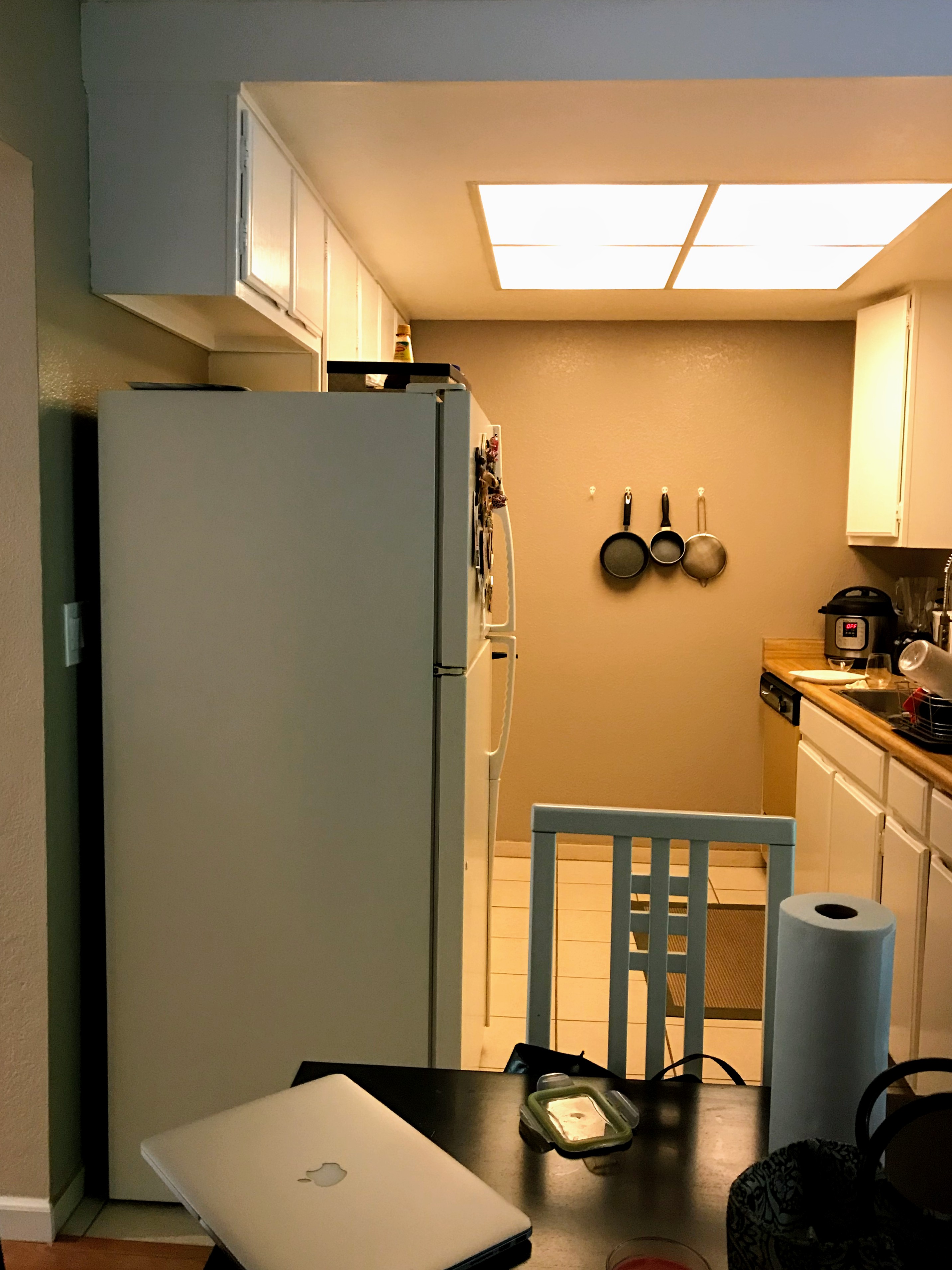 First thing’s first, let’s talk about the old kitchen layout and the obvious problems with it. This apartment has an open plan where the kitchen and dining are adjacent to each other and there’s one entry leading to both spaces (through the living room).