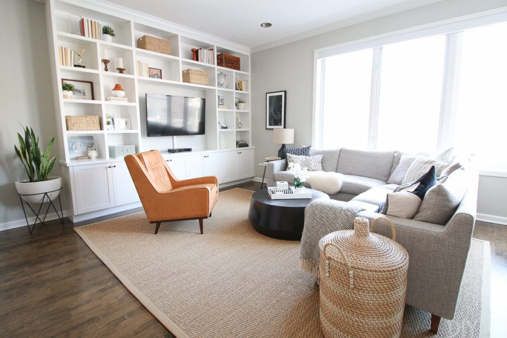 The combination of seagrass rug and plenty of woven baskets create a cozy room