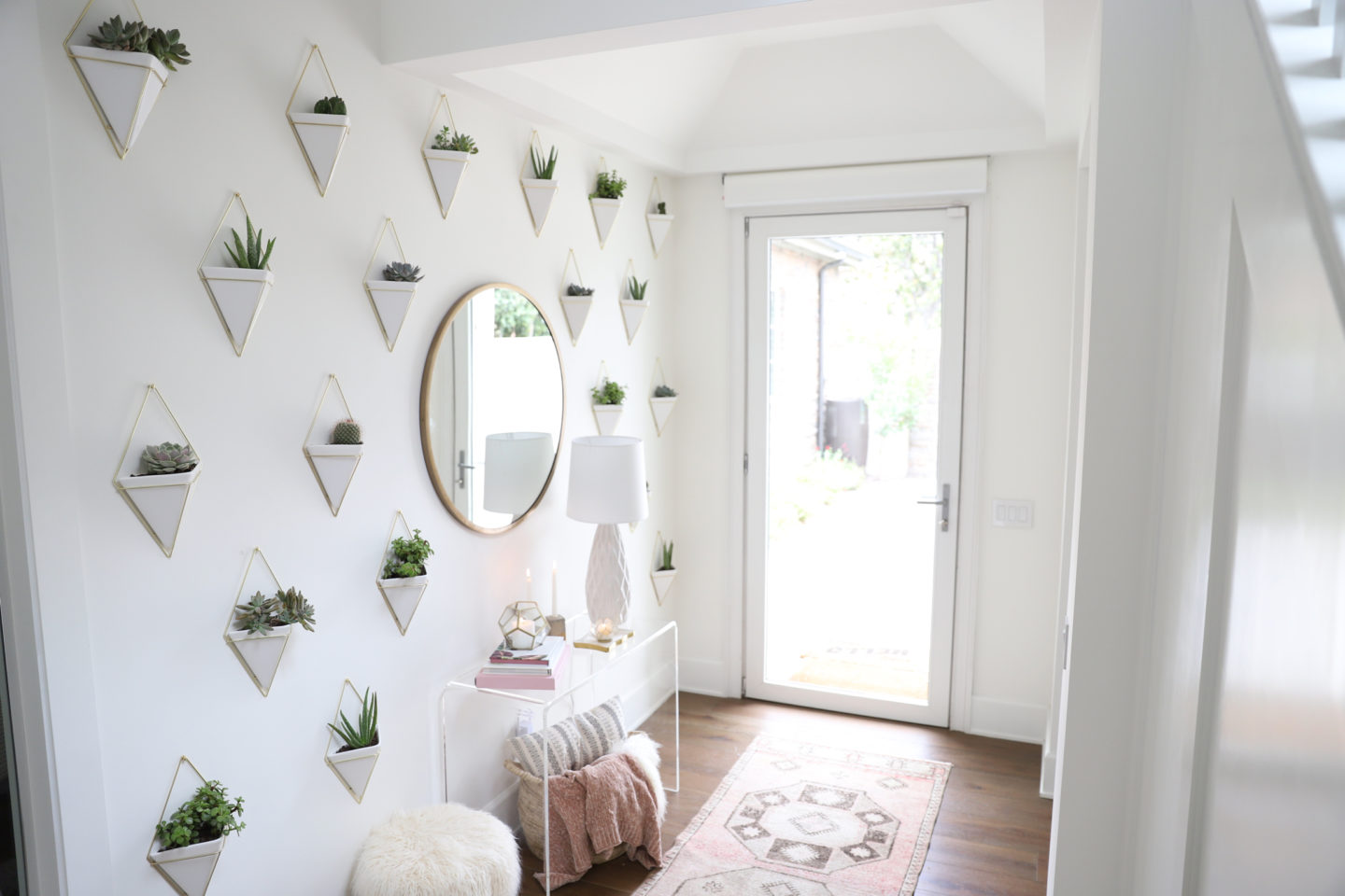 A collection of Umbra Trigg Planters creates a serene backdrop in this entryway
