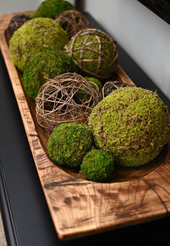 A rustic dough bowl centerpiece with moss and twine balls